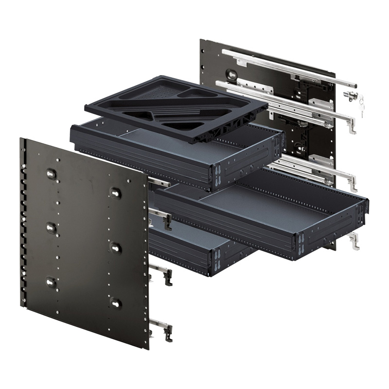 Coulisses et verrouillage sont prémontés. Chaque tiroir possède un réglage façade 3D. Hauteur intérieure caisson 509 soit 7HE+1.